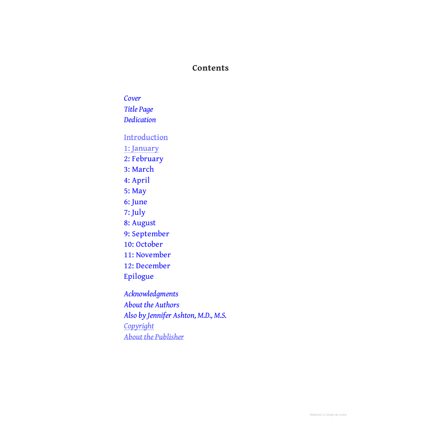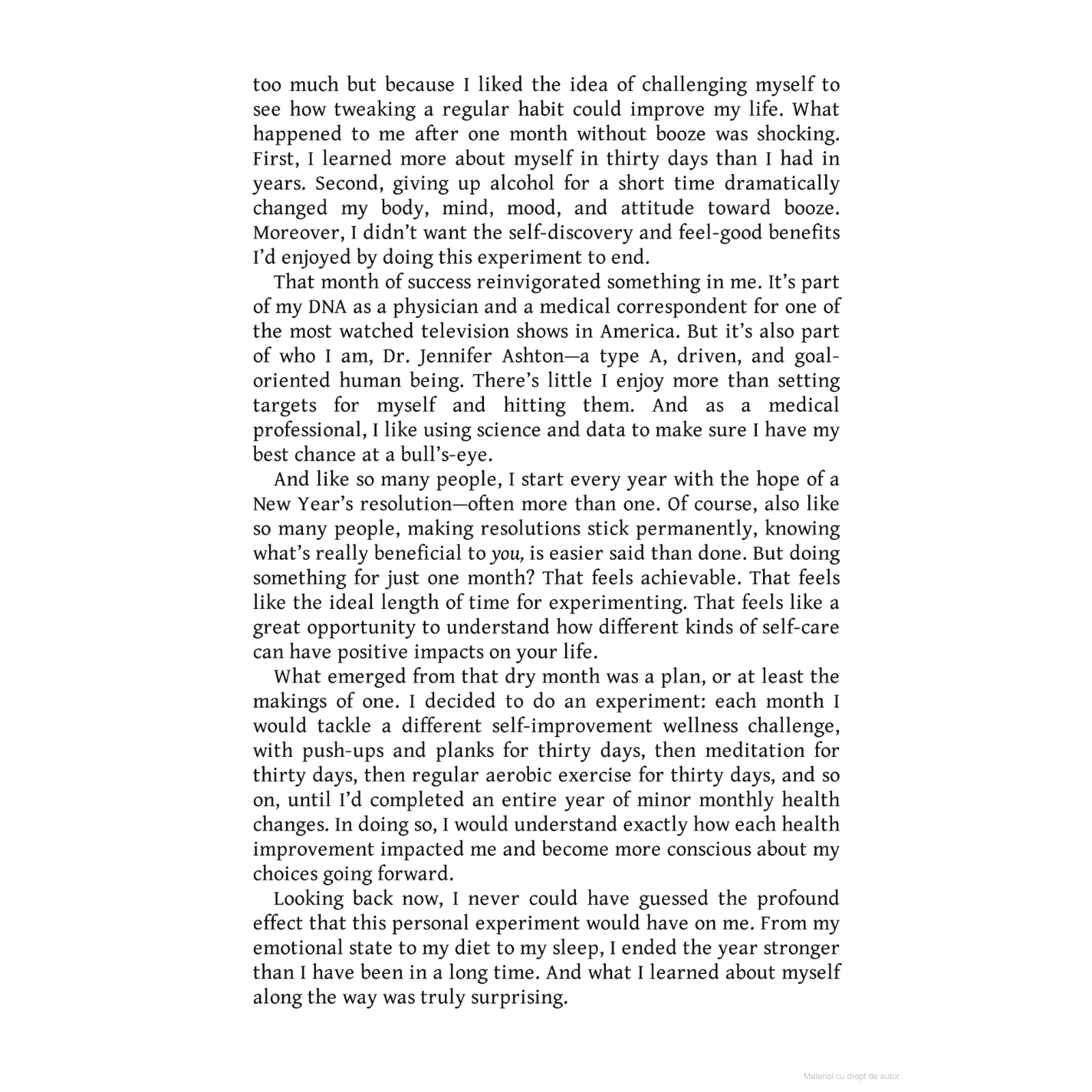 Fiecare luna vine cu un nou focus, fie ca este vorba despre hidratare, exercitii fizice, alimentatie sau somn. Jennifer Ashton iti arata cum sa integrezi aceste practici in rutina ta zilnica, fara sa te simți coplesita. Este cartea perfecta pentru femeile ocupate care vor sa isi prioritizeze sanatatea si bunastarea, dar nu stiu de unde sa inceapa. Cu sfaturi practice si motivatie pe masura, „The Self-Care Solution” iti ofera un ghid clar si accesibil pentru a-ti construi treptat o rutina de selfcare care sa iti schimbe viata.
