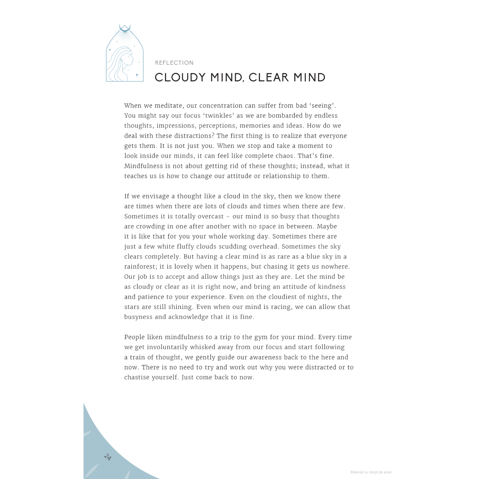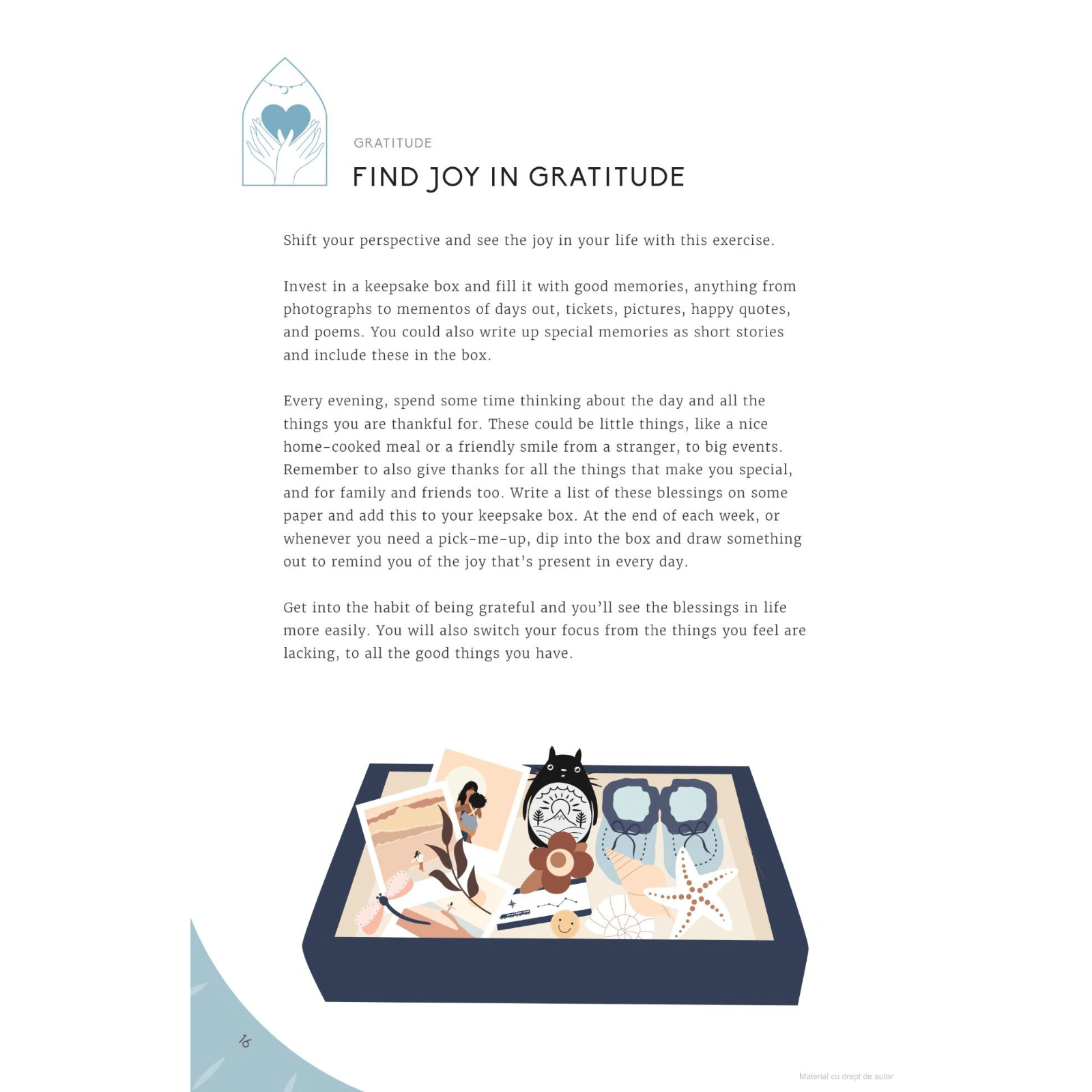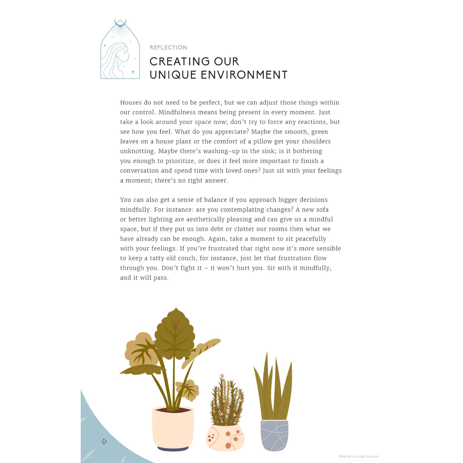 De-a lungul paginilor, vei descoperi cum sa iti creezi un ritual personal de wellness care sa iti hraneasca mintea, corpul si sufletul. Fiecare luna este dedicata unui set specific de practici si idei care te vor ajuta sa te conectezi mai profund cu tine insati si cu lumea din jur. De la meditatii ghidate la activitati creative si reflectii spirituale, aceasta carte este un adevarat compendiu de bine, creat pentru a te insoti pe parcursul unui an intreg de autocunoastere si crestere personala.
